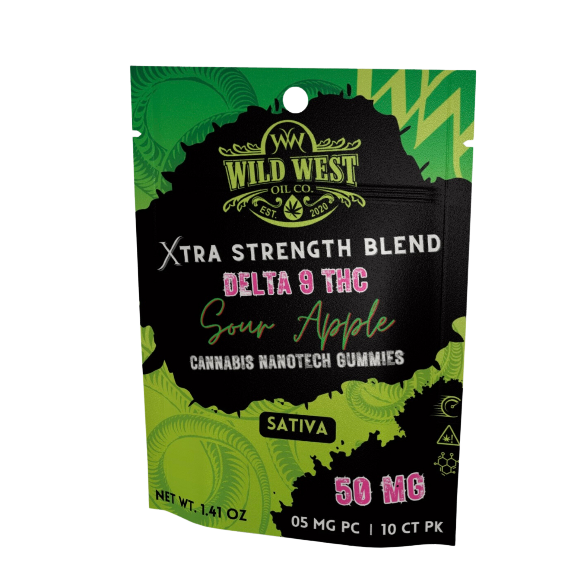 Our Xtra Strength Delta 9 Cannabis Blend is a handcrafted fast acting gummy line that is infused with the finest Wild West THC distillate oil. Wild West is mastering the art of the entourage effect and curating multi-cannabinoid blends for the optimal experience to satisfy our loyal customers. We use a highly advanced Nano- Technology that creates a faster onset and stronger effects within 30 minutes. Enjoy the best tasting medicated gummies in the Midwest! 50mg pack, 10pc, 5mg each pc.