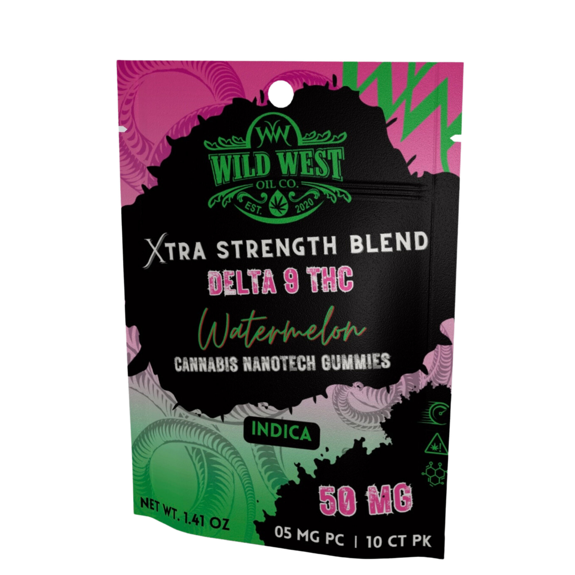 Our Xtra Strength Delta 9 Cannabis Blend is a handcrafted fast acting gummy line that is infused with the finest Wild West THC distillate oil. Wild West is mastering the art of the entourage effect and curating multi-cannabinoid blends for the optimal experience to satisfy our loyal customers. We use a highly advanced Nano- Technology that creates a faster onset and stronger effects within 30 minutes. Enjoy the best tasting medicated gummies in the Midwest! 50mg pack, 10pc, 5mg each pc.